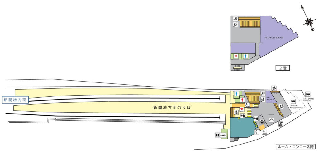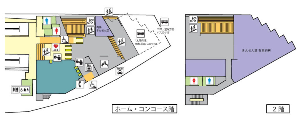 有馬溫泉站是神戶電鐵有馬線的終點站。附近毗鄰以有馬溫泉街為首的觀光景點。